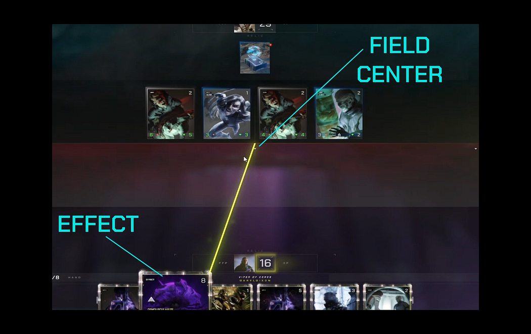 - Эффект, который « не имеет целей » или «нацелен на вас », воспроизводится в центре поля. (Примеры: Антиорганический импульс, Демолекуляризация, Исцеляющий рост, Невидимые союзники).