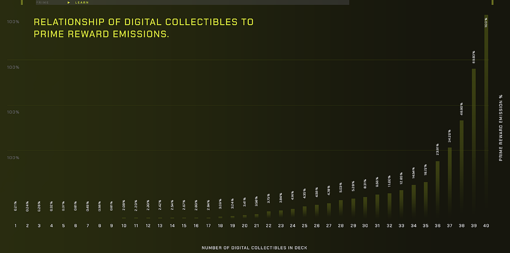 Ниже показано соотношение NFT в вашей колоде к эмиссии Prime reward, которую вы получите. Как вы можете увидеть, это чрезвычайно перегруженная верхняя кривая, и вашей первой целью должно быть приобретение полной колоды 40/40.