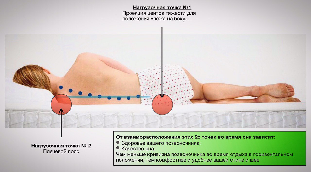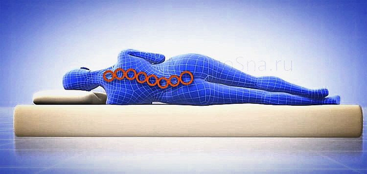 На раскладном диване или обычном матрасе первая нагрузочная точка - центр тяжести тела человека (примерно уровень крестца), максимально продавливает поверхность. При этом, вторая нагрузочная точка - плечевой пояс, практически не поглощается поверхностью, что усиливает искривление позвоночника. Любая подушка на таком случае лишь увеличивает деформацию спины. В такой позе давление внутри межпозвонковых дисков только повышается, особенно в местах наибольшей кривизны. Слишком жёсткий матрас, так же не даёт телу равномерно «погрузиться» в поверхность (рис.2).