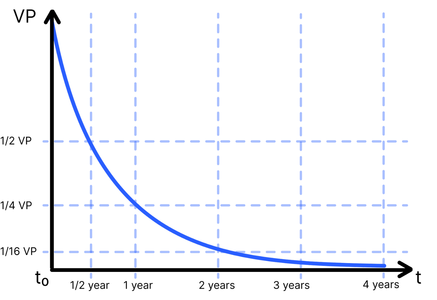 И вес их голосов, и доля эмиссии, которую они получают, зависят от их силы голоса (VP). Сила голоса определяется заблокированным балансом и временем, оставшимся до истечения срока действия блокировки. Если пользователь заблокирует свои токены на максимальный период блокировки — 4 года — он получает максимальную силу голоса, равную его заблокированному балансу. Затем их сила голоса начинает экспоненциально уменьшаться, так что каждые полгода она уменьшается вдвое или уменьшается в 4 раза каждый год. Значит, через полгода это будет ½ остатка, через год — ¼, а через 4 года — 1/256.
