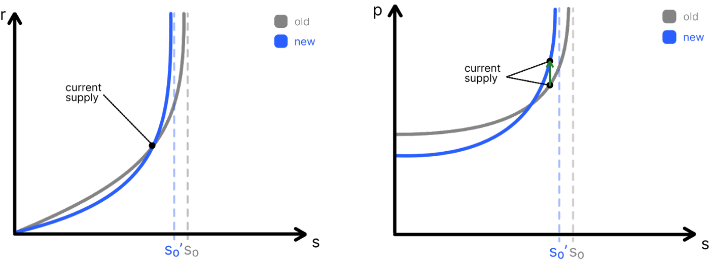 Удорожание происходит путем изменения параметров s0 и таким образом, что резерв и предложение остаются неизменными, а цена растет. Это изменяет форму кривой привязки, и после повышения цены торговля продолжается на новой кривой привязки.