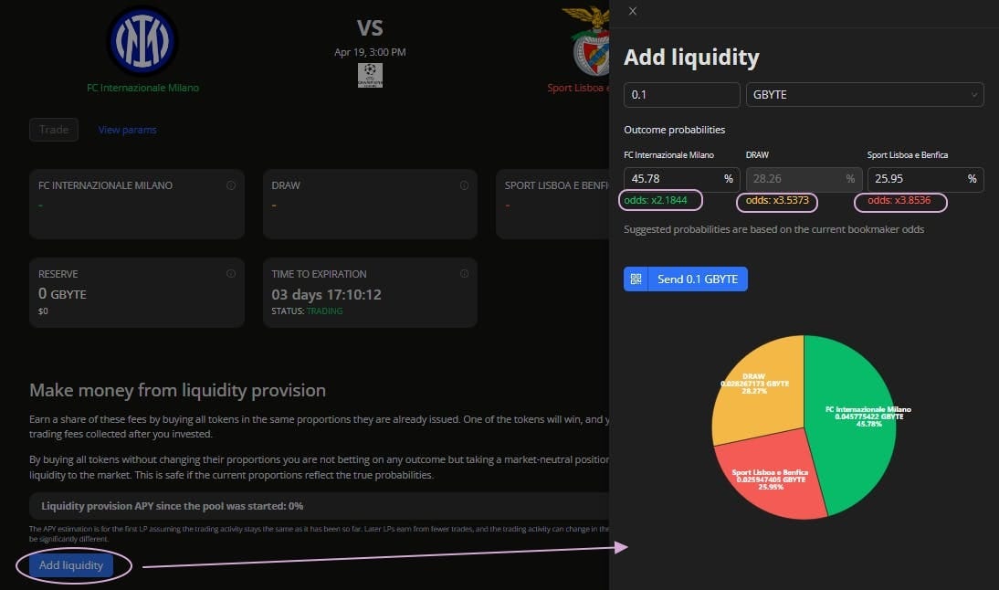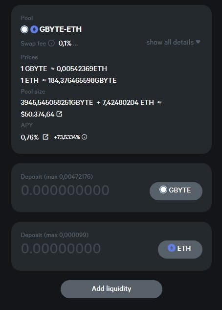 Как только эти токены появятся в вашем арсенале, зайдите на Oswap.io и укажите ликвидность в доступных пулах (например, GBYTE-USDC, GBYTE-WBTC, OETH-ETH и т. д.). После этого шага вы получите взамен токены поставщика ликвидности, и вам следует отправить их на адрес автономного агента 7AUBFK4YAUGUF3RWWYRFXXF7BBWY2V7Y , указанный на Liquidity.obyte.org , для 7-дневной блокировки. Вот и все! Награды будут распределены после блокировки периода.
