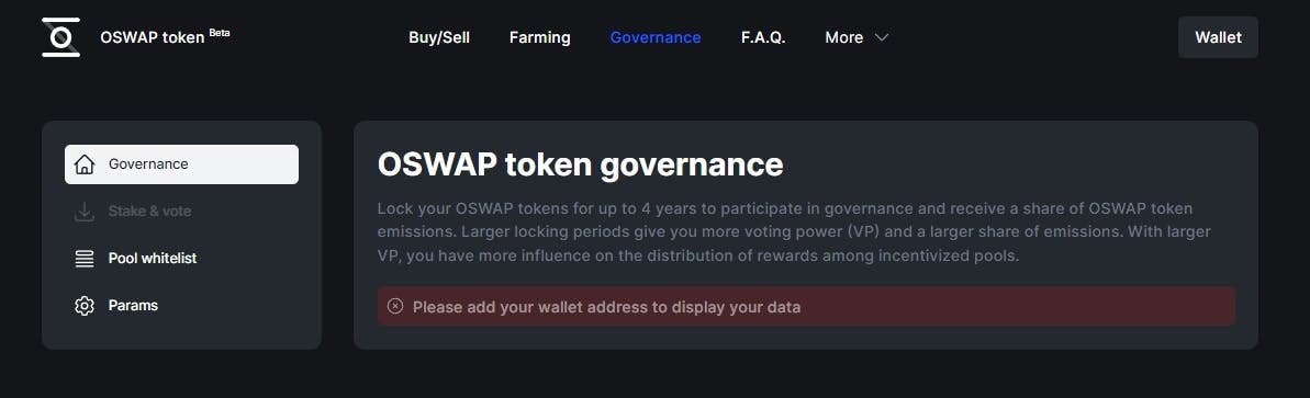 Количество вице-президентов определяет вес ваших голосов при голосовании по управленческим решениям (например, новым пулам, комиссиям или распределению вознаграждений). Он также определяет долю эмиссии токенов, которые вы реализуете. Количество токенов OSWAP, которые вы застейкали, и оставшаяся продолжительность блокировки напрямую влияет на ваш VP, в результате чего увеличенные периоды блокировки приводят к более высокому VP и более высоким вознаграждениям. Стейкеры в целом получают 50% акций OSWAP.
