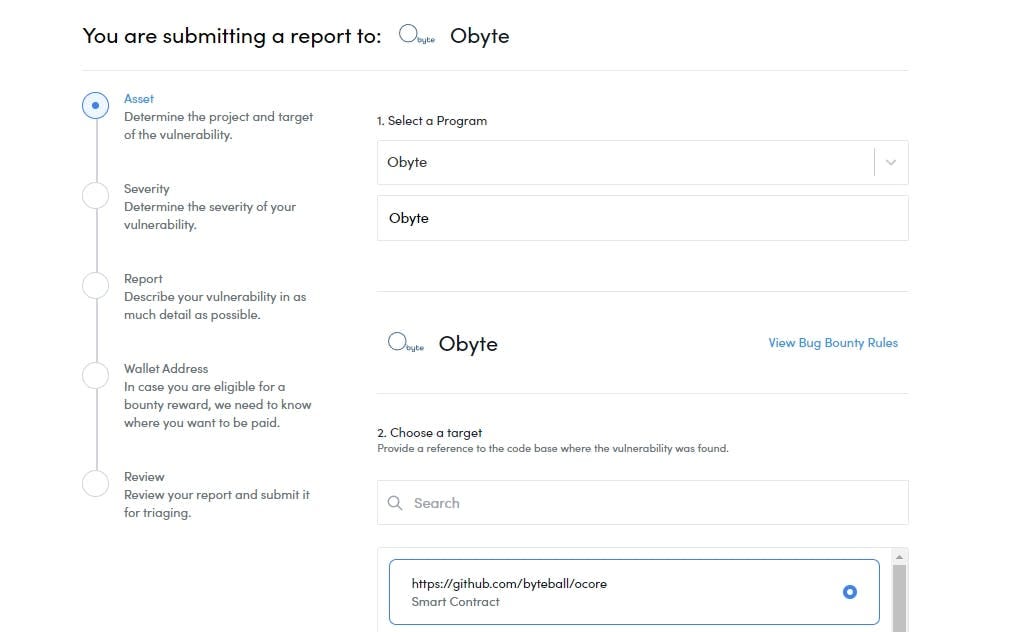 Прежде всего, необходимо зарегистрироваться на сайте Immunefi и нажать кнопку “Submit a report” на персональной панели. Затем выбирается актив (в данном случае Obyte), репозиторий GitHub, в котором обнаружена ошибка, и последствия, которые эта ошибка может вызвать — например, прямую кражу средств пользователей. Следующий этап — выбор уровня серьезности в соответствии со шкалой Immunefi.