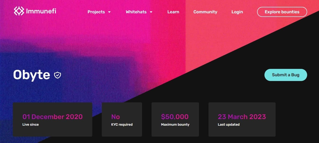 Immunefi служит ведущим центром вознаграждения за обнаружение ошибок и служб безопасности для криптопроектов, обеспечивая защиту более чем 60 миллиардов долларов пользовательских средств в многочисленных проектах. Благодаря инклюзивному подходу они охватывают широкий спектр цепочек и сетей, в том числе Obyte. Они классифицируют баги по пятибальной шкале: отсутствие, низкий, средний, высокий и критический как для самого реестра (DLT), так и для их смарт-контрактов, а так же их веб-сайтов и приложений.