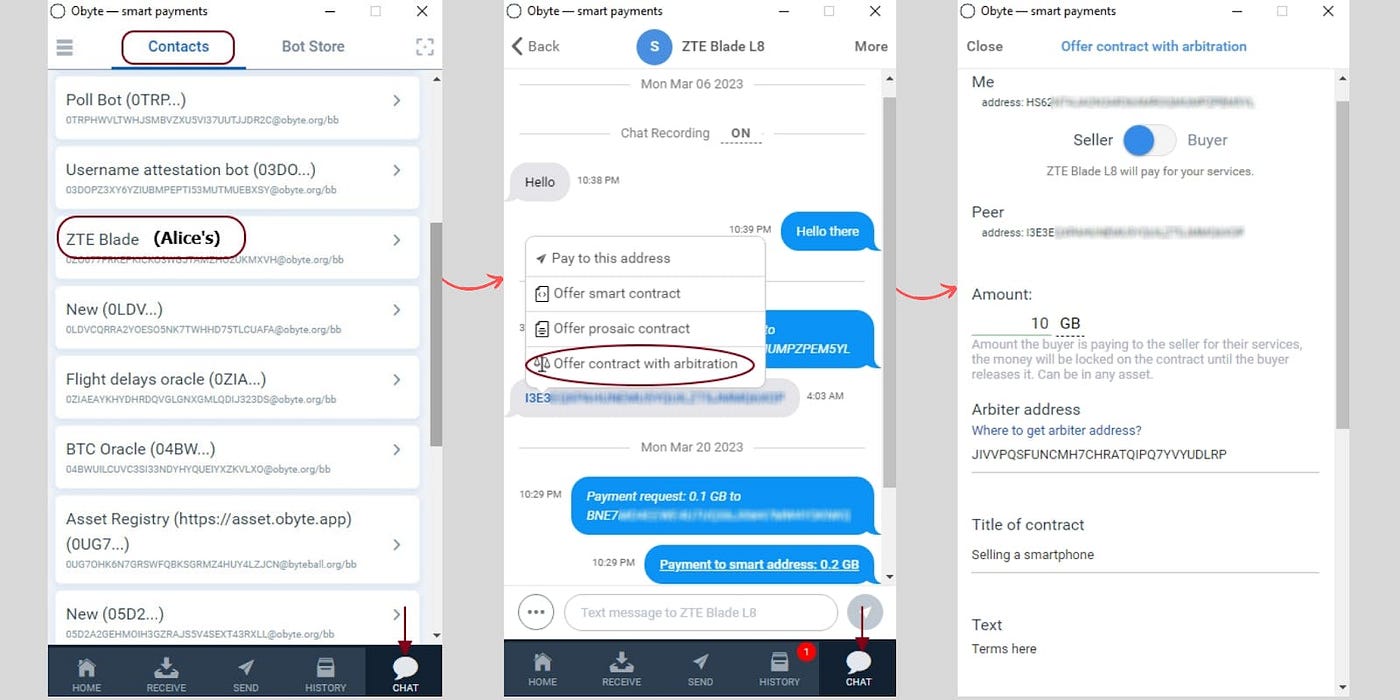 Стороны могут обсудить и скопировать соглашение через зашифрованный чат, а также принять решение об арбитраже в ArbStore. После этого покупатель сообщает продавцу свой адрес Obyte, а продавец предлагает заключить арбитражный договор, нажав на него. Далее остается только заполнить все поля, оплатить договор и отправить товар.