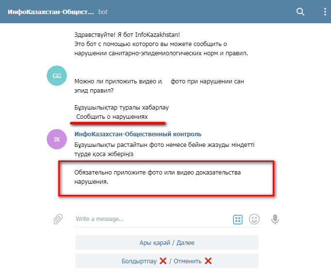 - Здравствуйте! Я бот InfoKazakhstan! Это бот с помощью которого вы можете сообщить о нарушении санитарно-эпидемиологических норм и правил.