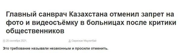 Общественный деятель, председатель ООИ "Подранки" ("Шарасыздар") больше года переписывается с Минздравом и Генпрокуратурой, оспаривая законность запрета на фото- и видеосъёмку в организациях здравоохранения. В этой связи в адрес Генеральной прокуратуры было отправлены обращения. Полагаю, что эти запросы привели к отказу от первоначальных установок Минздрава в части запрета съёмок в медучреждениях", – заключила она.