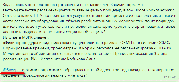 «Физиопроцедуры осуществляется в рамках ГОБМП и в системе ОСМС. Нормирование времени, хронометраж и нормы расходов не регламентированы НПА РК. Кобикова А.