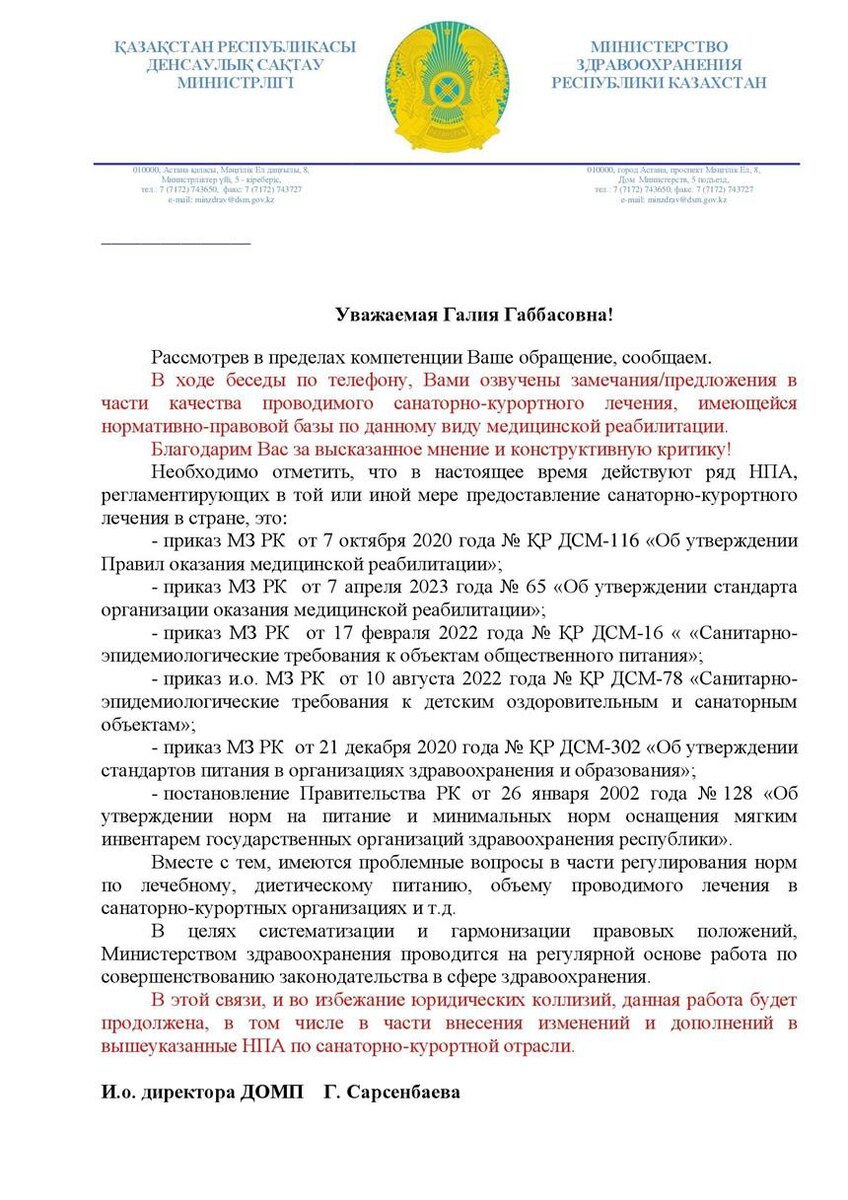 12 апреля 2024 года была на приеме у первого вице министра Т. Султангазиева по вопросам санаторно-курортного лечения лиц с инвалидностью. Третий год госслужащие минздрава и минтруда ҚР Еңбек және халықты әлеуметтік қорғау министрлігі Қазақстан Республикасы Денсаулық сақтау министрлігі перекидывают заявителя друг к другу, видимо по причине высокой ответственности за ответы. А может просто потому, что не владеют нормативами и заниматься не хотят?