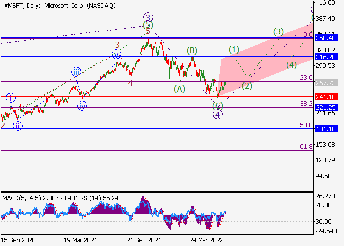 На дневном графике сформирована третья волна старшего уровня 3, и завершилось развитие нисходящей коррекции в качестве четвёртой волны 4. В настоящий момент началось формирование пятой волны 5, в составе которой развивается первая заходная волна младшего уровня (1) of 5. Если предположение верно, то цена актива вырастет к отметкам 316.20–350.40. Критическим уровнем стоп-лосса для данного сценария является отметка 241.00.