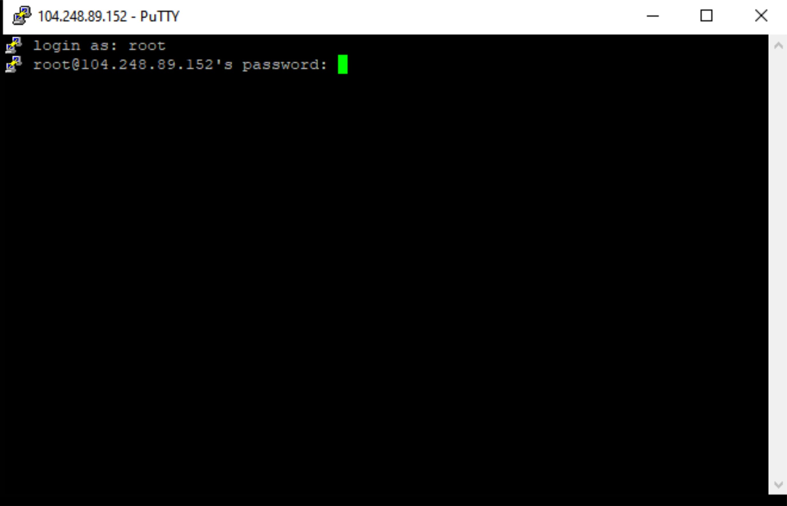 В открывшемся окне нужно ввести логин и пароль который вы придумывали при создании сервера. По умолчанию логин будет root — именно это является вашим логином. После логина нажимаем ENTER. копируем пароль и (внимание!) вставляем однократным нажатием правой кнопки мышки. Пароль не будет отображаться, нажимаем ENTER.