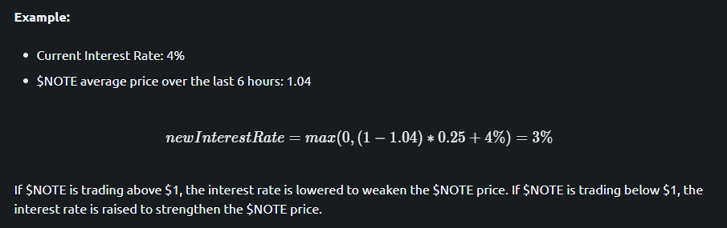 - Если $NOTE < $1, процентная ставка по CLM увеличивается, чтобы повысить спрос на получение $NOTE на вторичных рынках