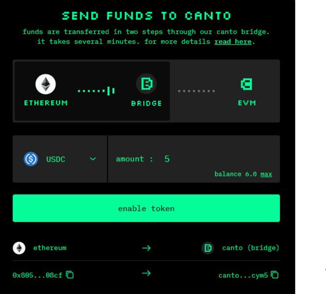 В настоящее время мост $ETH - $CANTO поддерживает переводы $ETH, $USDC и $USDT.