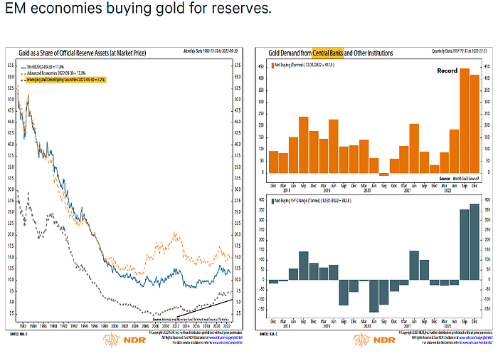 Доля золота в активах центральных банков развивающихся рынков (EM) достигла своего дна в 2008 году, т.е. в то же время, когда доллар был на пике своего могущества. После финансового кризиса глобальный Юг решил, что с него хватит быть выходной ликвидностью для Pax Americana, и начал делать сбережения в золоте, а не в казначейских облигациях.