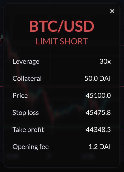 - Выберите размер залога - насколько вы хотите рисковать (например, 10% прибыли при залоге 50 DAI → 5 DAI, а при залоге 5000 DAI → 500 DAI). 1500 - минимальный размер позиции с учетом кредитного плеча (например, 100 DAI с кредитным плечом 15x = 100 *15 = 1500).