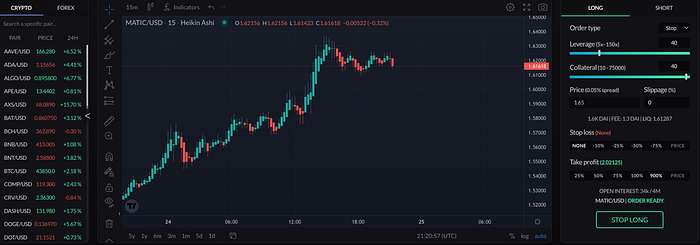 Альтернативный вариант - изменить тип ордера на "Limit Long", если вы все еще хотите совершить длинную позицию от цены ниже рыночной. В данном примере длинная позиция на $1,60 в $MATIC будет ниже рыночной цены на момент снимка экрана.