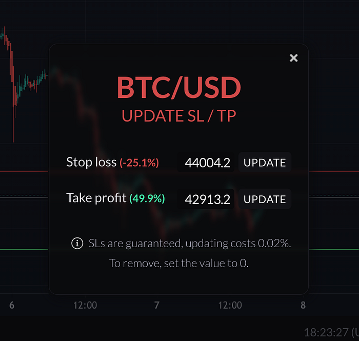 - Если вы нажмете на цену ликвидации сделки / стоп-лосс или тейк-профит, откроется окно, позволяющее обновить значения тейк-профита / стоп-лосса.