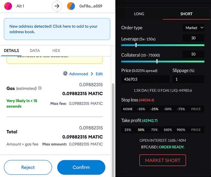 Во-первых, прежде чем вы сможете открыть свою первую сделку на платформе, вам понадобится кошелек (Metamask), подключенный к PoS-цепочке Polygon (Matic) или Arbitrum (Ethereum), токены MATIC или Ethereum для оплаты транзакций и токены DAI (USD stablecoin) для открытия сделок.