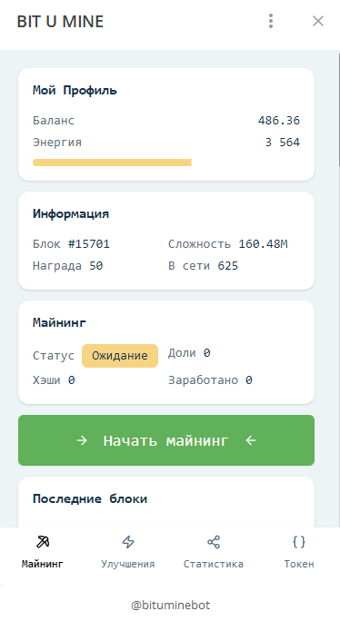 BIT U MINE - это процесс добычи криптовалюты на основе технологии блокчейн, который осуществляется с помощью специального приложения, разработанного на основе Telegram Mini-App.