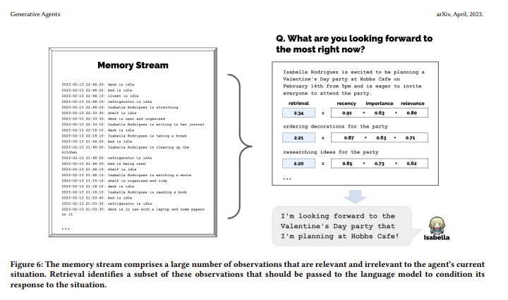 – Далее вообще все наблюдения о мире записывают в memory stream (типа: (1) Isabella Rodriguez is setting out the pastries, (2) Maria Lopez is studying for a Chemistry test while drinking coffee, (3) Isabella Rodriguez and Maria Lopez are conversing about planning a Valentine’s day party at Hobbs Cafe, (4) The refrigerator is empty.)
