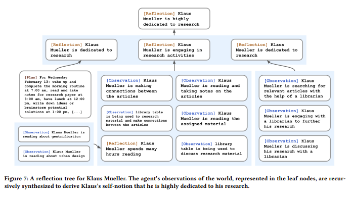 Consider a scenario in which Klaus Mueller is asked by the user: “If you had to choose one person of those you know to spend an hour with, who would it be?" With access to only observational memory, the agent simply chooses the person with whom Klaus has had the most frequent interactions: Wolfgang, his college dorm neighbor. Unfortunately, Wolfgang and Klaus only ever see each other in passing, and do not have deep interactions. A more desirable response requires that the agent generalize from memories of Klaus spending hours on a research project to generate a higherlevel reflection that Klaus is passionate about research, and likewise recognize Maria putting in effort into her own research (albeit in a different field), enabling a reflection that they share a common interest. With the approach below, when Klaus is asked who to spend time with, Klaus chooses Maria instead of Wolfgang