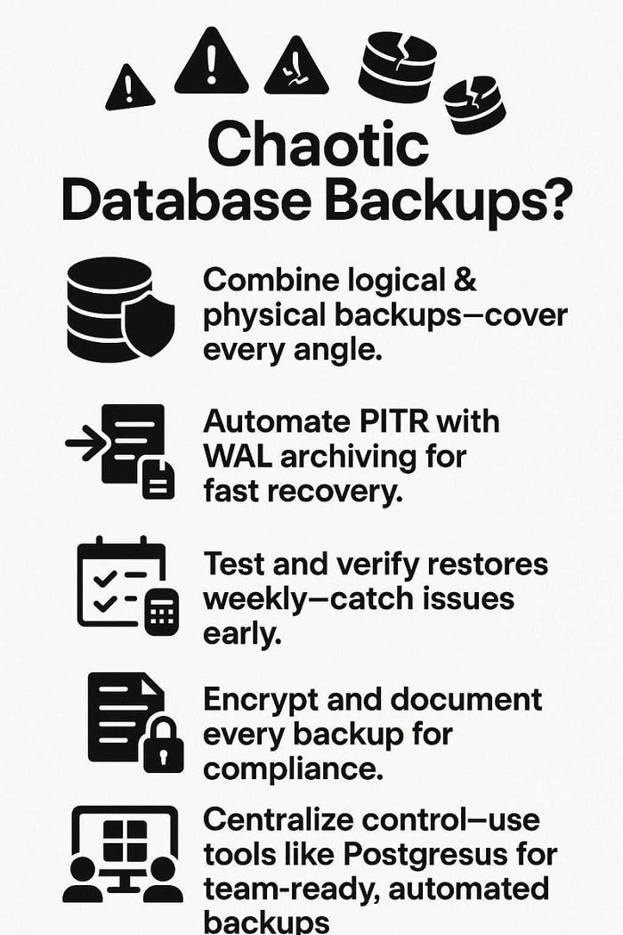 Start by defining your Recovery Point Objective (RPO) and Recovery Time Objective (RTO) based on actual business requirements rather than technical convenience. These metrics should drive your backup frequency, storage locations, and testing schedule. For most production PostgreSQL databases, this means implementing continuous WAL archiving for minimal RPO, maintaining multiple backup generations for flexible recovery options, and automating both backup creation and verification.