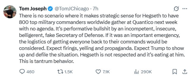 Теперь тревога распространилась по всему миру после беспрецедентного призыва министра обороны Пита Хегсета «срочно» созвать всех адмиралов и генералов всех вооруженных сил США в Квантико: