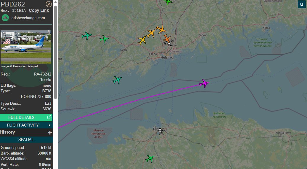 Напомним, что грубейшее нарушение суверенитета Эстонии, о котором они так беспокоятся, связано с тем, что российский самолет пролетел по узкой трассе, представляющей собой своего рода правовой коридор между Эстонией и ИЭЗ Финляндии. Наглядный снимок этого маршрута с регулярного рейса: