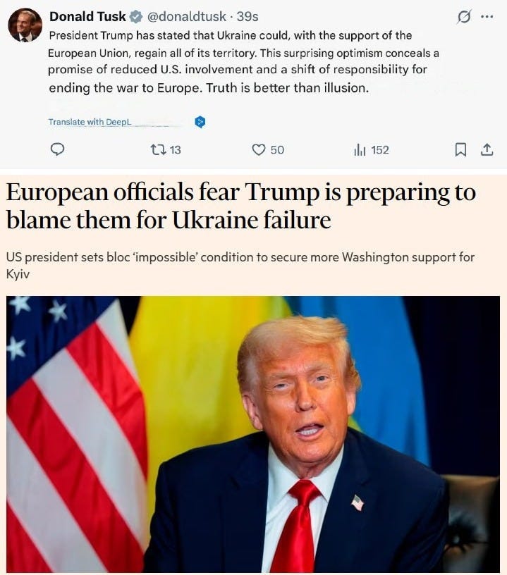 Между тем, наше чтение о так называемом «повороте» Трампа против России оказалось хорошо поддержано, поскольку другие заинтересованные европейские деятели также подхватили очевидный поступок Трампа: