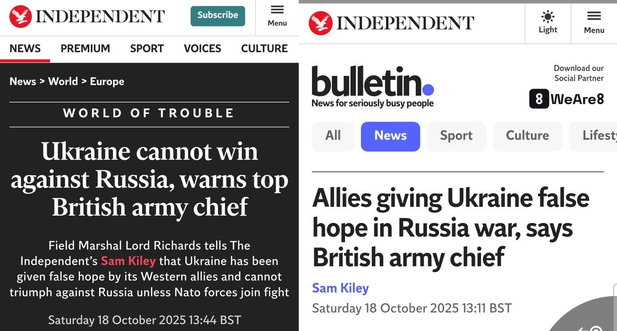 Фельдмаршал лорд Ричардс, который был главой всех британских вооруженных сил, самым старшим руководителем в командной структуре, считает, что у Украины нет надежды на победу. Хотя эта точка зрения стала обычным явлением, ключевое различие здесь заключается в том, что Ричардс считает, что у Украины нет шансов даже с теми ресурсами, которые союзникам удается собрать и передать: