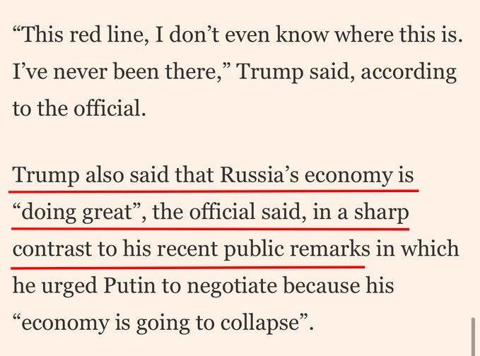 Если этого недостаточно, то частное мнение Трампа об экономической ситуации в России также является полной противоположностью его публичному мнению. Вспомните видео, которое я только что опубликовал в прошлой статье, где Трамп говорит, что экономика России «рушится» — кажется, даже он не верит в собственную чушь: