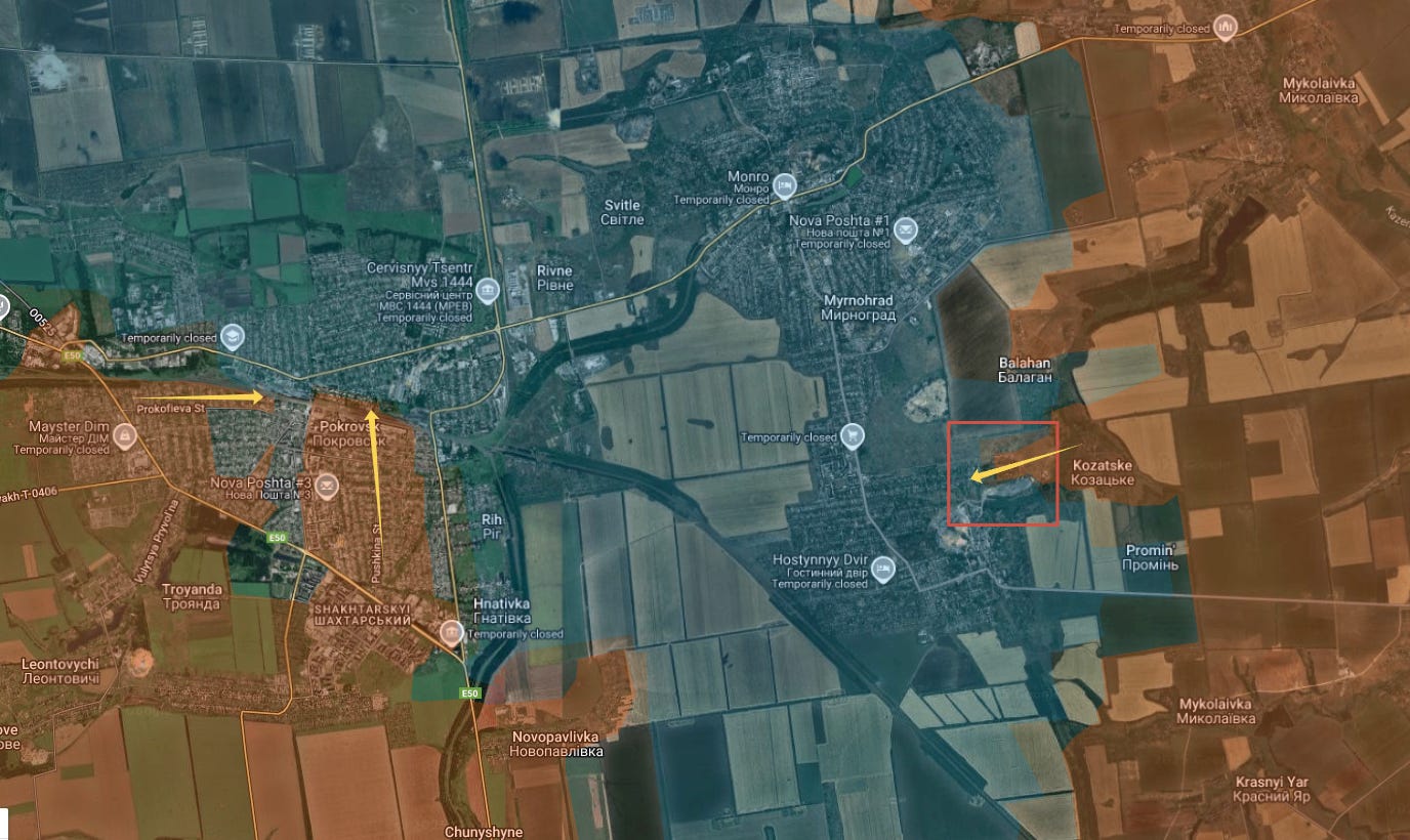 В Покровске российские войска только укрепляют центр города, подтягивают логистику и укрепляются для продвижения вперед. В соседнем Мирнограде российские войска продолжают вклиниваться в сам город на его южной окраине: