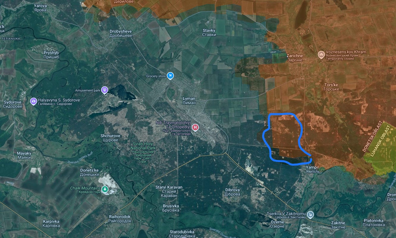 На лиманском направлении российские войска закрепили путь к самому городу, захватив значительную территорию, примерно соответствующую синей линии ниже: