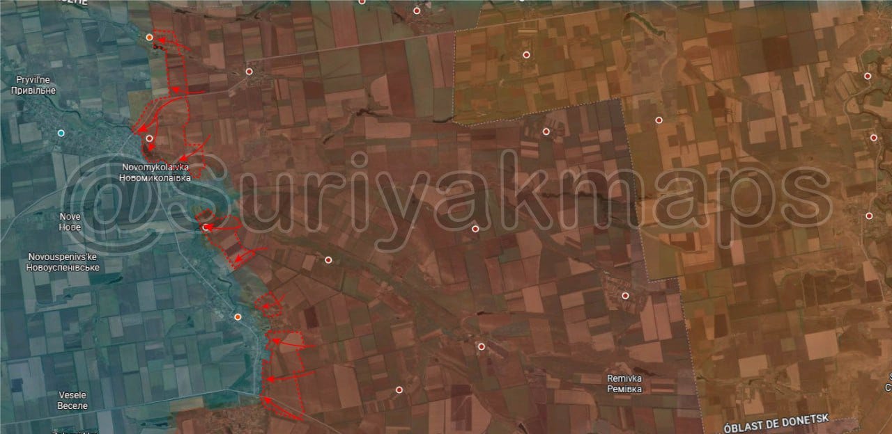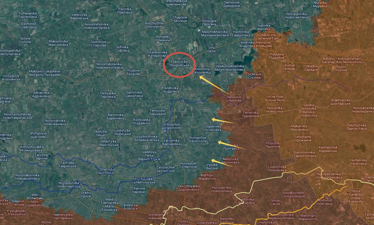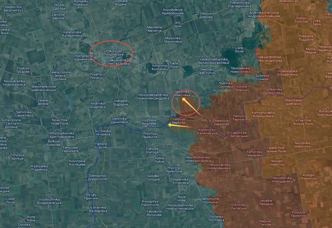 При ближайшем рассмотрении видно, что новый удар из ранее захваченного Вербове направляется прямо в сторону Покровского, что по-русски пишется как Покровское: