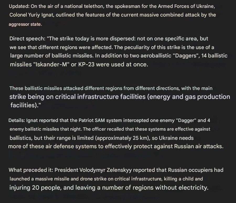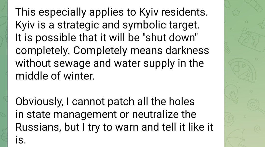 В прошлом крупные города, такие как Киев, могли оказать гораздо более серьезное сопротивление, потому что передовые ракетные системы НАТО, такие как Patriot и IRIS-T, были в состоянии уничтожить российские крылатые ракеты, в то время как мобильные группы борьбы с беспилотниками могли уничтожить большую часть российских «Гераней» и других ложных целей. Но теперь, похоже, достигнута критическая масса, когда огромное количество объектов способно преодолеть оборону, что дает России, возможно, первую реальную возможность полного господства над энергосистемой Украины.