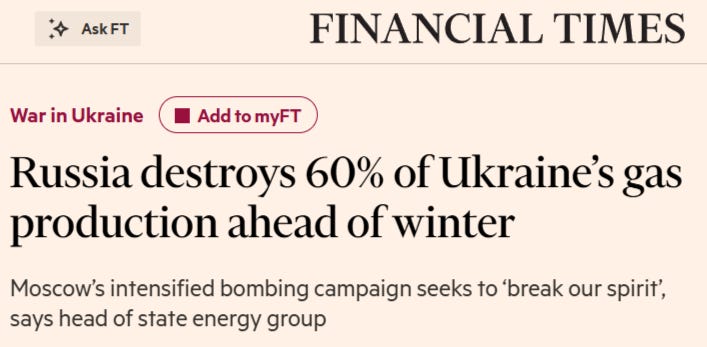Это произошло после беспрецедентных ударов по нефтегазовым объектам Украины, которые, как выяснилось, разрушили умопомрачительные 60% добычи газа в Украине: