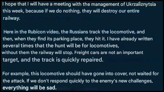 По вражеским каналам приходят сообщения о том, что Украина в скором времени останется без железной дороги. Локомотивы и депо в последнее время стали важнейшими целями для герани, так как пути быстро ремонтируются после обстрелов, а подвижного состава имеется большое количество в наличии.