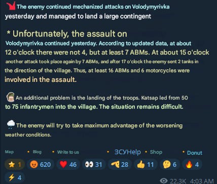 Официальный аккаунт Глубинного Государства признал, что российским войскам удалось высадить от 50 до 75 пехотинцев в деревне, что звучит так, как будто штурм мог быть успешным: