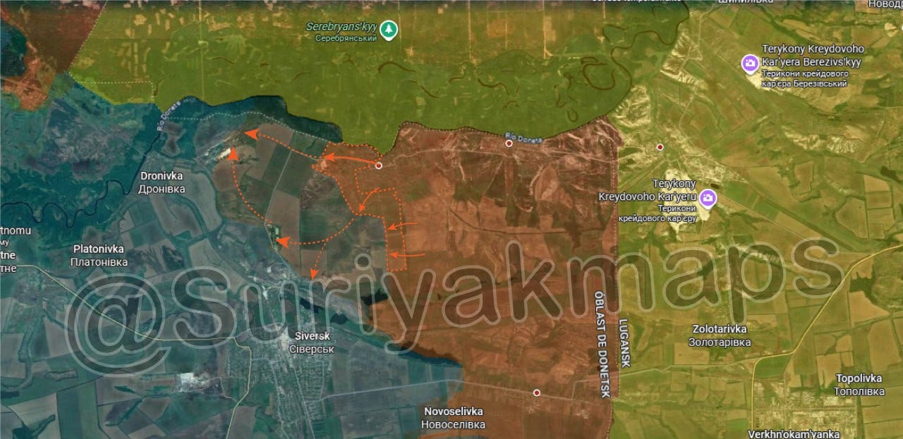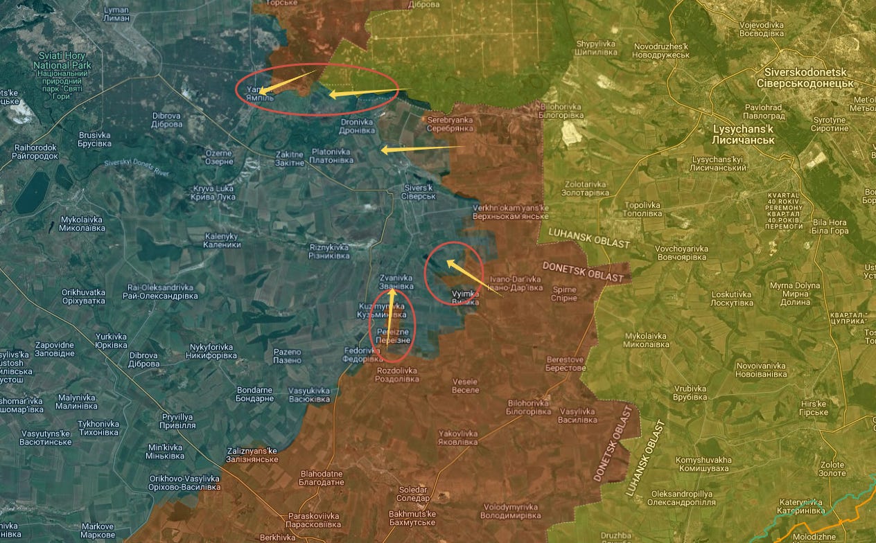 Как видно к северу оттуда, Серебрянский лесной массив разрушен для ВСУ, и россияне продвигаются через еще большую часть Ямполя. В Сурьяке вся территория к северу от Северска также находится под частичным контролем России — отсюда и светлое обозначение: