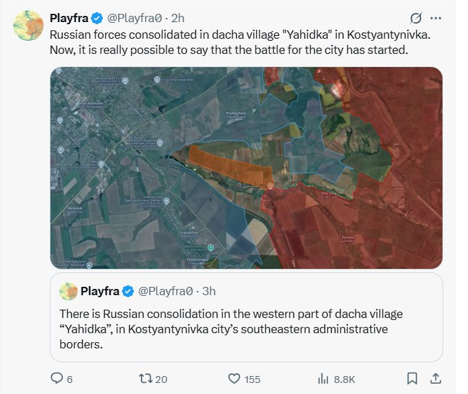 В Константиновке российские войска медленно приближаются к городу, захватывая все прилегающие районы. Из украинского источника: