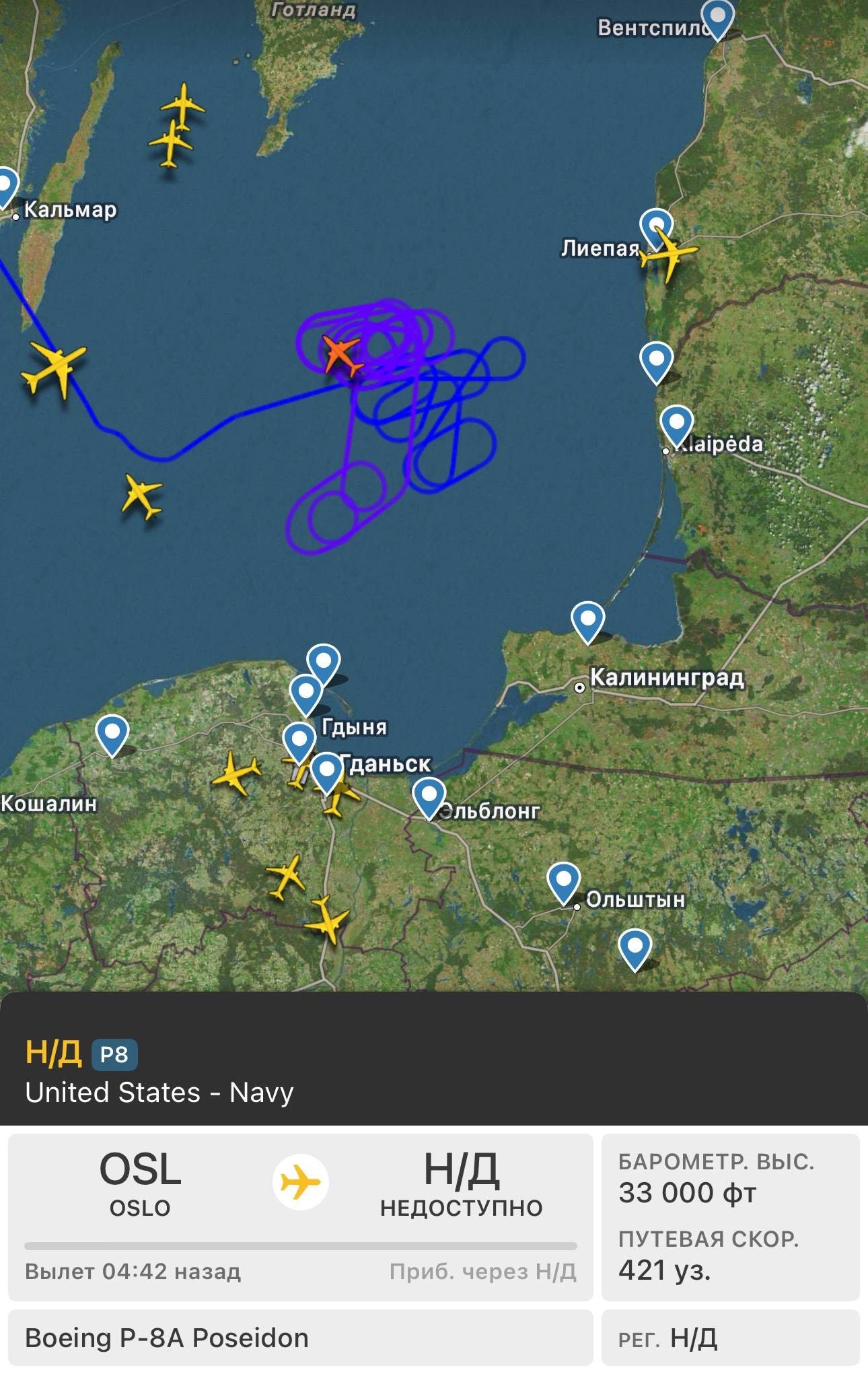 Тем временем P-8A Poseidon ВМС США уже несколько часов кружит над Балтийским морем в районе Калининградской области.