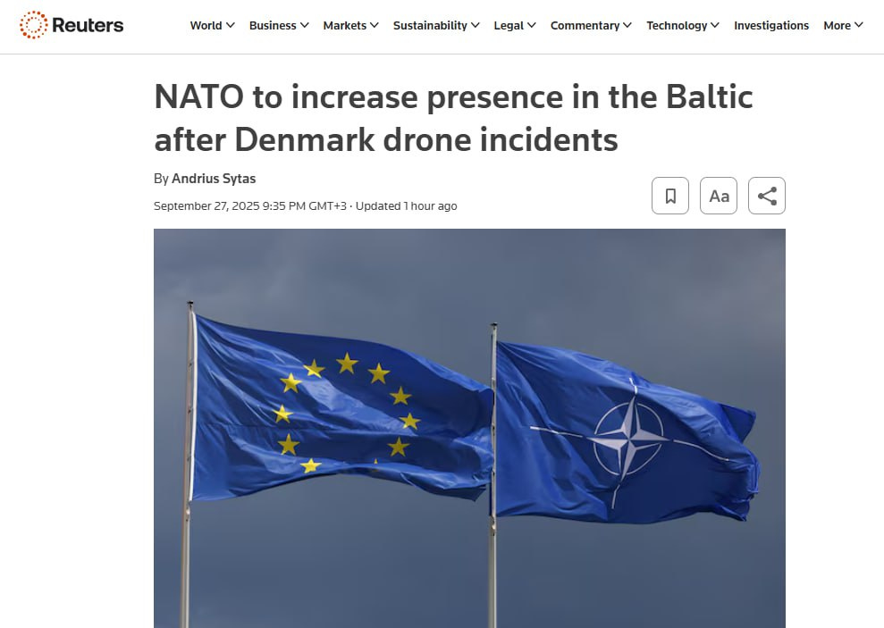 Говоря о беспилотниках, вот прекрасная иллюстрация того, чего достигают операции под чужим флагом — тезис, антитезис, синтез. Во-первых, у нас есть фальшивая угроза беспилотника МИ-6 о закрытии европейских аэропортов, в которой обвиняют Россию без каких-либо доказательств. Затем, кстати, НАТО использует эту мистификацию для повышения напряженности и введения большей милитаризации в регионе: