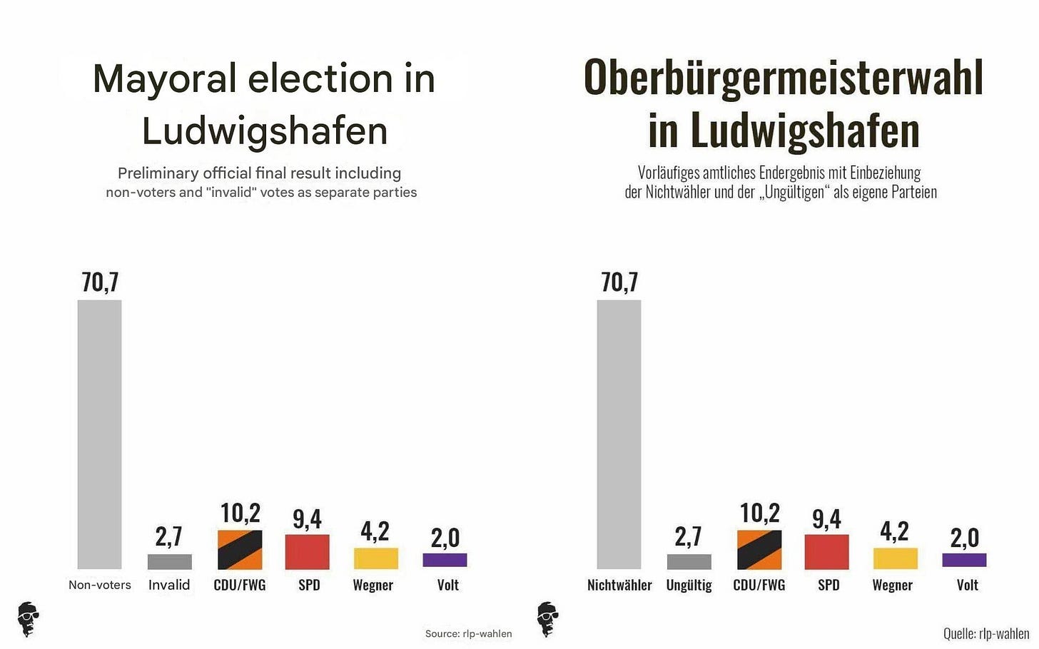 В Германии, например, последний гротескный провал «демократии» был замечен в федеральной земле Рейнланд-Пфальц, где кандидату в мэры от АдГ в городе Людвигсхафен Йоахиму Паулю было запрещено баллотироваться на пост мэра на основании доклада немецкой внутренней разведки (BfV), в котором содержались возмутительные заявления о том, что Пауль представляет собой некую угрозу конституции, основанную на «непатриотичной» деятельности, включая его похвалу Лорду Пау. Кольца. По-видимому, его вера в то, что трилогия Толкина «Властелин колец» отражает «консервативные ценности», была своего рода «опасным» националистическим собачьим свистком; больше нет предела нелепым минимумам, до которых они опустятся, занимаясь железными дорогами и забрасывая мешками с песком законных кандидатов, представляющих угрозу для Порядка, основанного на Уловке.