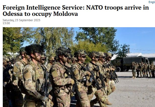 Пресс-бюро Службы внешней разведки Российской Федерации сообщает, что, по информации, поступившей в СВР, брюссельские евробюрократы полны решимости держать Молдову в русле своей русофобской политики. Это планируется сделать любой ценой, включая ввод войск и фактическую оккупацию страны. На данном этапе силы НАТО концентрируются в Румынии у молдавских границ. В Одесской области Украины готовится «десант» НАТО для устрашения Приднестровья. По имеющимся данным, в Одессу уже прибыла первая группа военнослужащих из Франции и Великобритании.