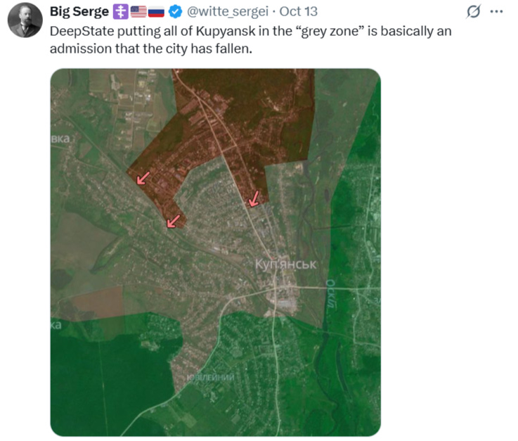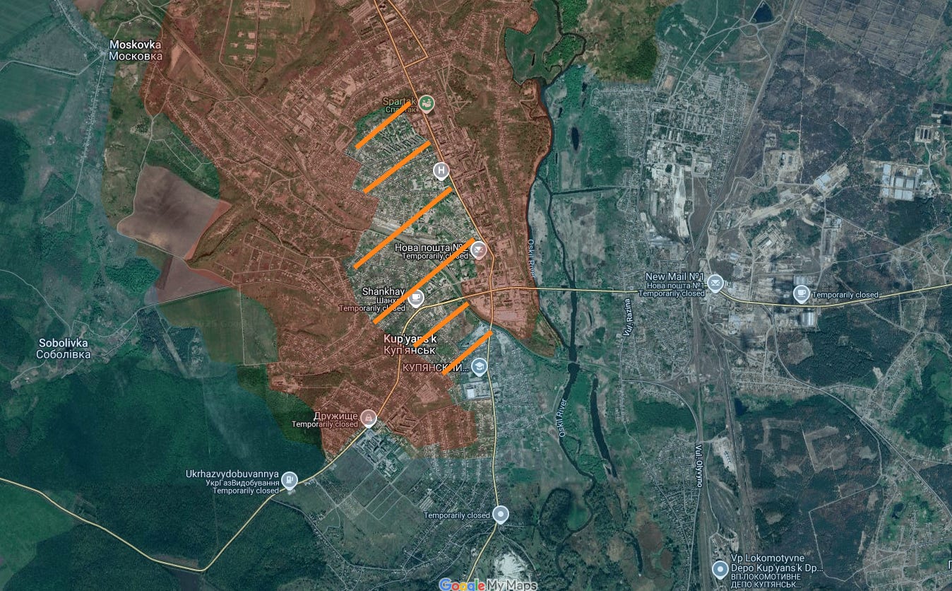 В Купянске нет никаких серьезных изменений, кроме признания картографами того, что центральный «котел» на самом деле освобожден ВСУ. Тем не менее, в течение следующих нескольких дней россияне проводят «операции по прочесыванию», чтобы зачистить дома в этом большом районе, и поэтому на данный момент он остается «слегка окрашенным», чтобы обозначить еще не «полный» захват.