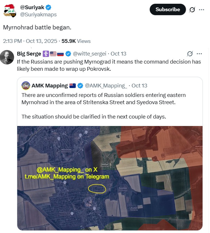 Совершенно очевидно, что Покровск на данный момент находится в гораздо более опасном положении, хотя для российской стороны ему не хватает того массового количества «расходуемых» штрафных батальонов Storm-Z, которые доблестно возглавили финальный штурм Авдеевки.