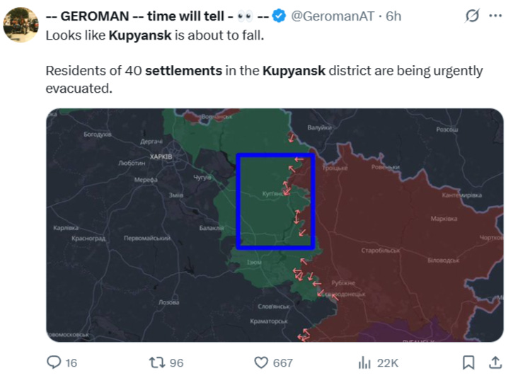 В прошлом месяце глава украинской областной военной администрации Андрей Канашевич отметил, что из самого Купянска мало кто эвакуируется, намекнув, что они ждут, когда россияне придут их «освобождать».