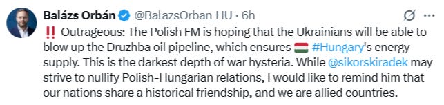 Реальные атаки на Румынию и Венгрию произошли всего через несколько дней после того, как Европа, по сути, дала карт-бланш на террористические атаки по всему ЕС, поскольку несколько высокопоставленных европейских чиновников открыто потворствовали не только атакам на «Северных потоках», но даже нападениям на венгерские нефтепроводы. Министр иностранных дел Польши Сикорский обращается к президенту Венгрии Петеру Сийярто: