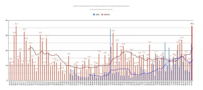 Среднесуточное наступление Вооруженных Сил Российской Федерации в районе проведения специальной военной операции. Обновление основано на данных с 17 по 20 октября 2025 года. Скорость продвижения +36,3 км² в сутки за период, общая скорость пробега 145 км².